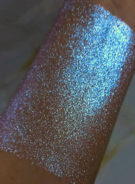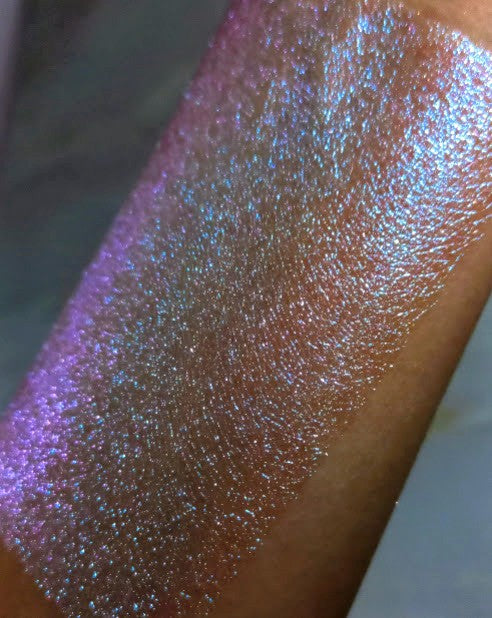 Un pigmento duocromo cautivador que cambia de un azul eléctrico intenso a un lavanda etéreo con reflejos rosados, como la luz de la luna danzando sobre el agua. Su acabado metálico ultra reflectante crea un efecto hipnótico que se transforma con cada giro de luz.