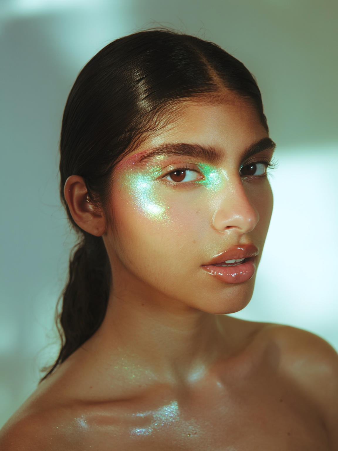 Un brillo azul hielo con destellos verde menta, fresco y luminoso, como un respiro de calma